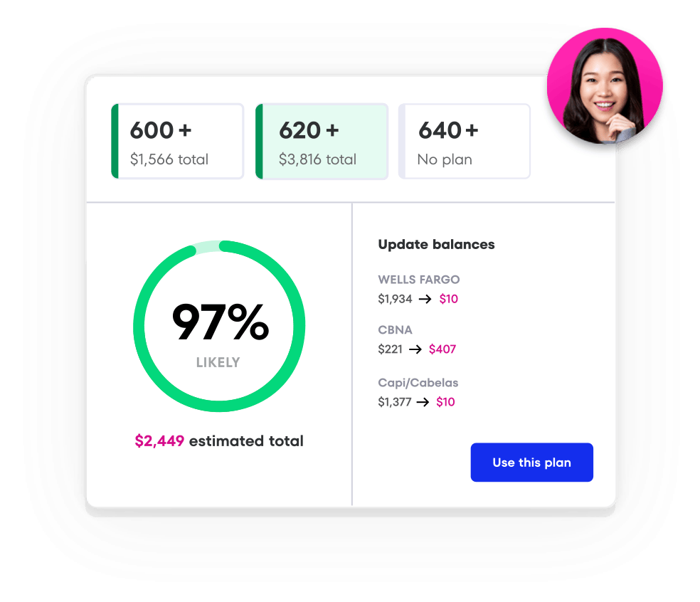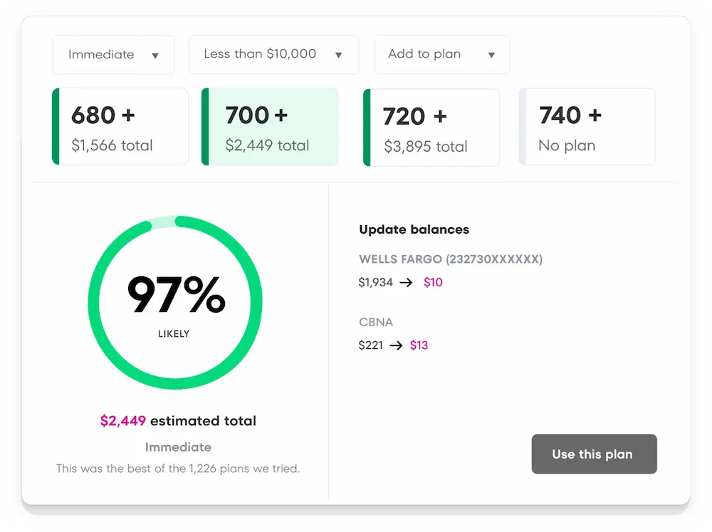 Our predictive AI-driven credit optimization engine presents you with a recommended plan – and the likelihood of your borrower reaching a target score. All you have to do is click “use this plan."