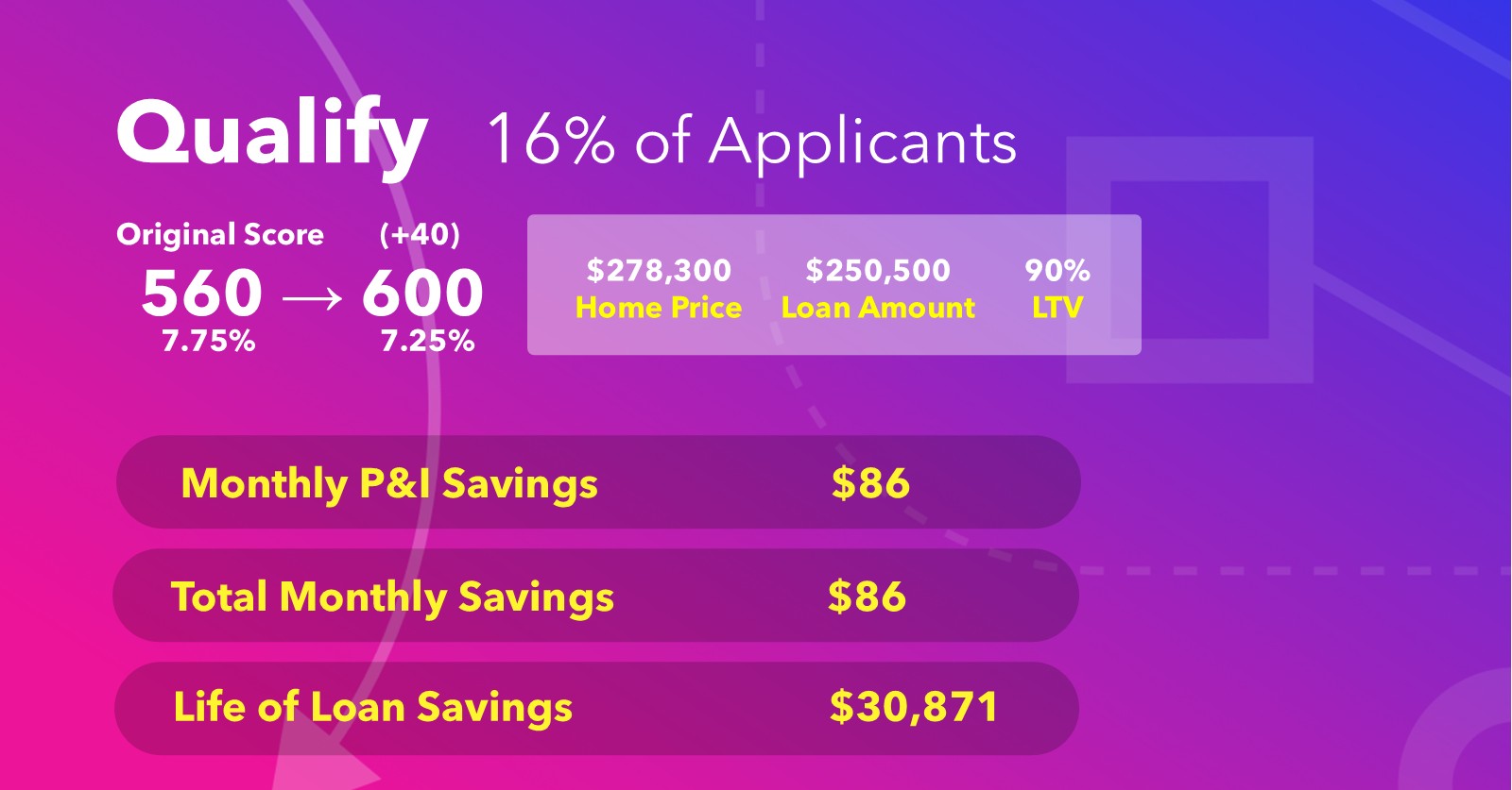 For 16% of your applicants, the difference between a denial and a closing is closer than you think. Starting at a 560, a +40 point boost gets them to 600 — the qualifying threshold that changes everything. On a $250,500 loan, that jump from 7.75% to 7.25% saves $86/month and $30,871 over the life of the loan. You’ve already paid for the credit report. Credit Optimization helps you turn that cost into a closed deal.