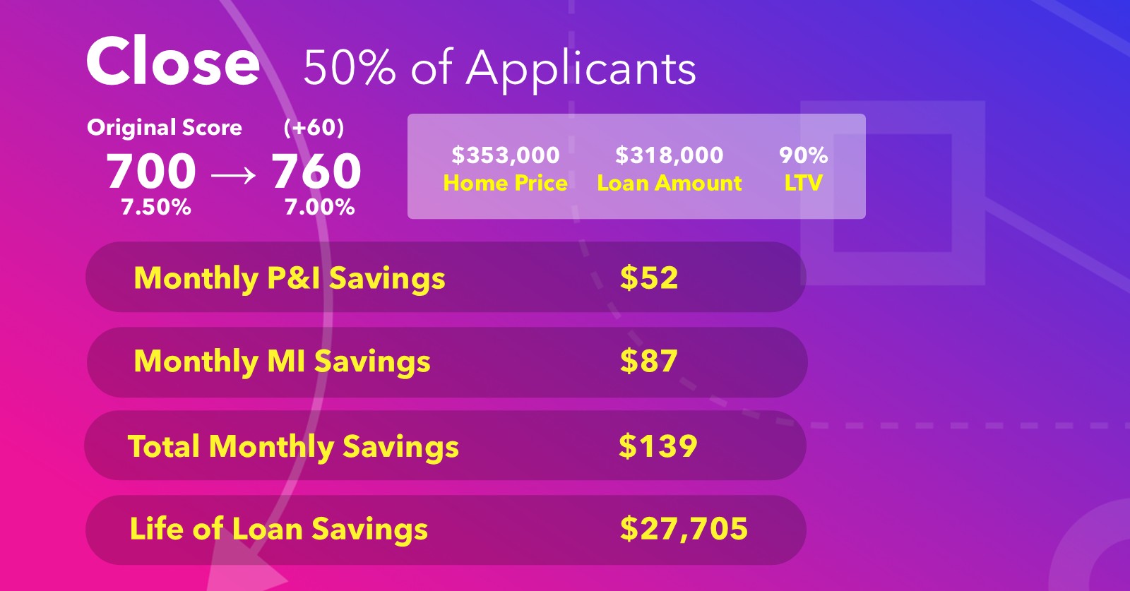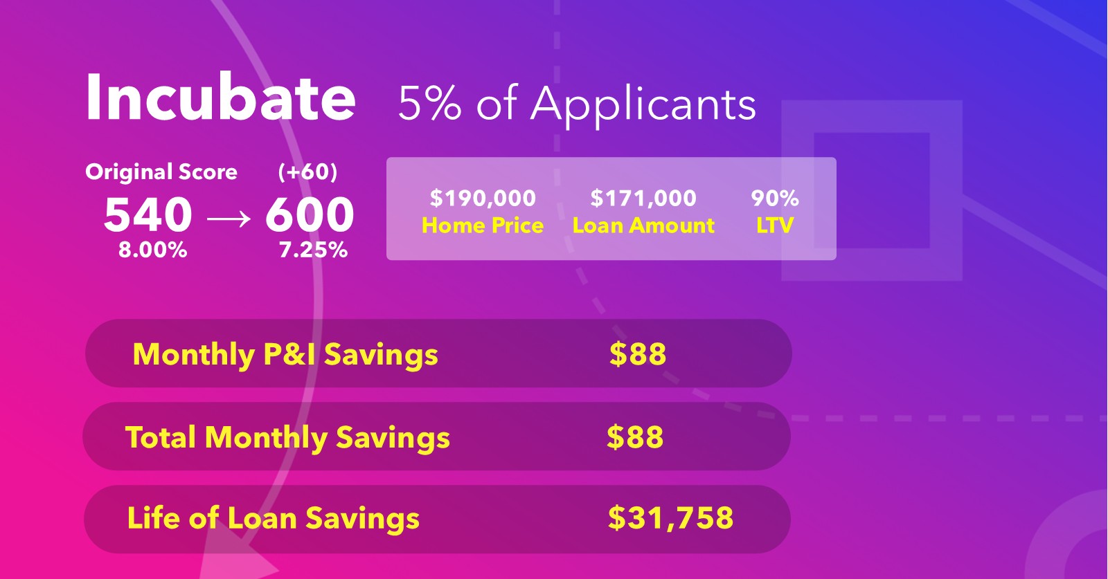 You’ve already invested in pulling their credit — don’t let a 540 score be the end of the conversation. With Credit Optimization, these applicants can gain +60 points, reaching a 600 and crossing the threshold into FHA eligibility. On a $171,000 loan, that score improvement drops their rate from 8.00% to 7.25%, saving them $88/month and $31,758 over the life of the loan. These borrowers aren’t lost leads — they’re future closings worth nurturing.