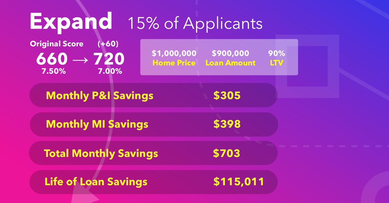 These borrowers already qualify for a conventional loan, but why settle? A +60 point gain from 660 to 720 opens the door to jumbo loan eligibility and dramatically better terms. On a $900,000 loan, the rate drops from 7.50% to 7.00%, slashing $703/month in combined P&I and MI savings — and $115,011 over the life of the loan. The credit has been pulled. Now maximize what it can do.