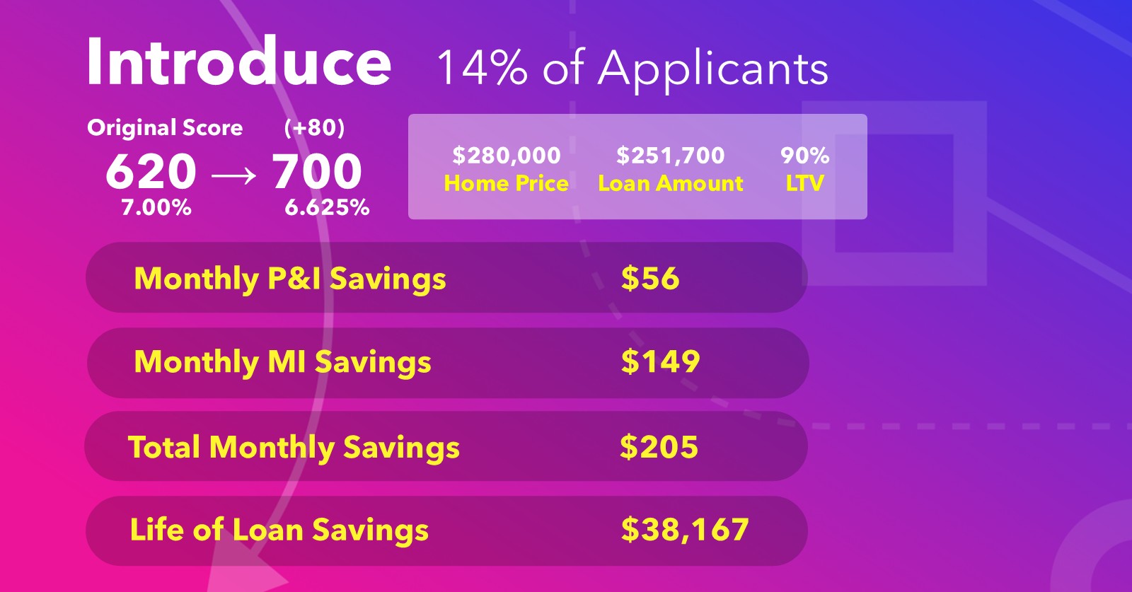 These applicants are already in the game — they just need a better seat at the table. A +80 point improvement moves them from a 620 to a 700, unlocking meaningfully better rates and lower PMI. On a $251,700 loan, the rate drops from 7.00% to 6.625%, delivering $205/month in combined savings and $38,167 over the life of the loan. The credit report is already purchased — Credit Optimization ensures it’s working as hard as it should be.